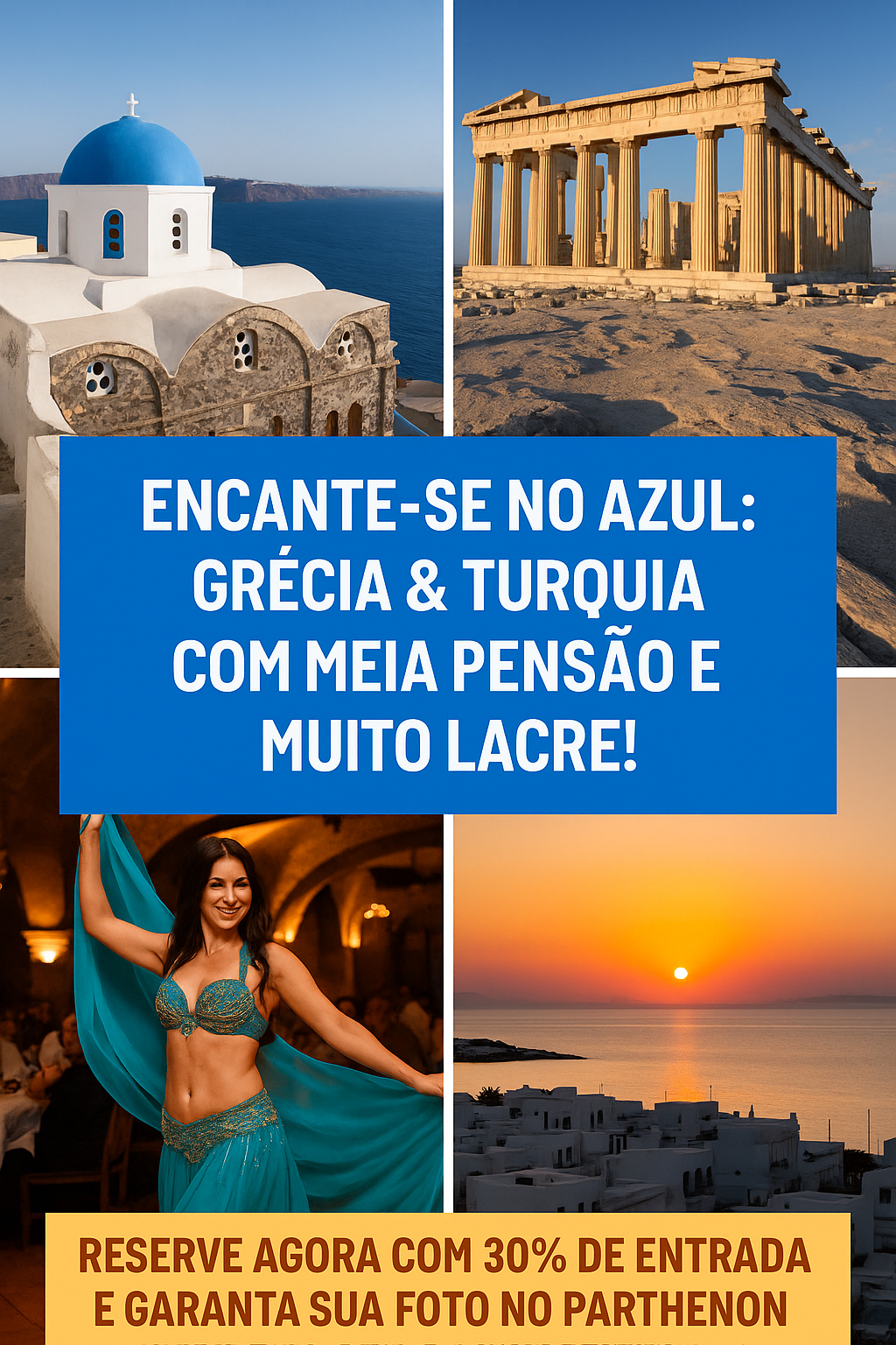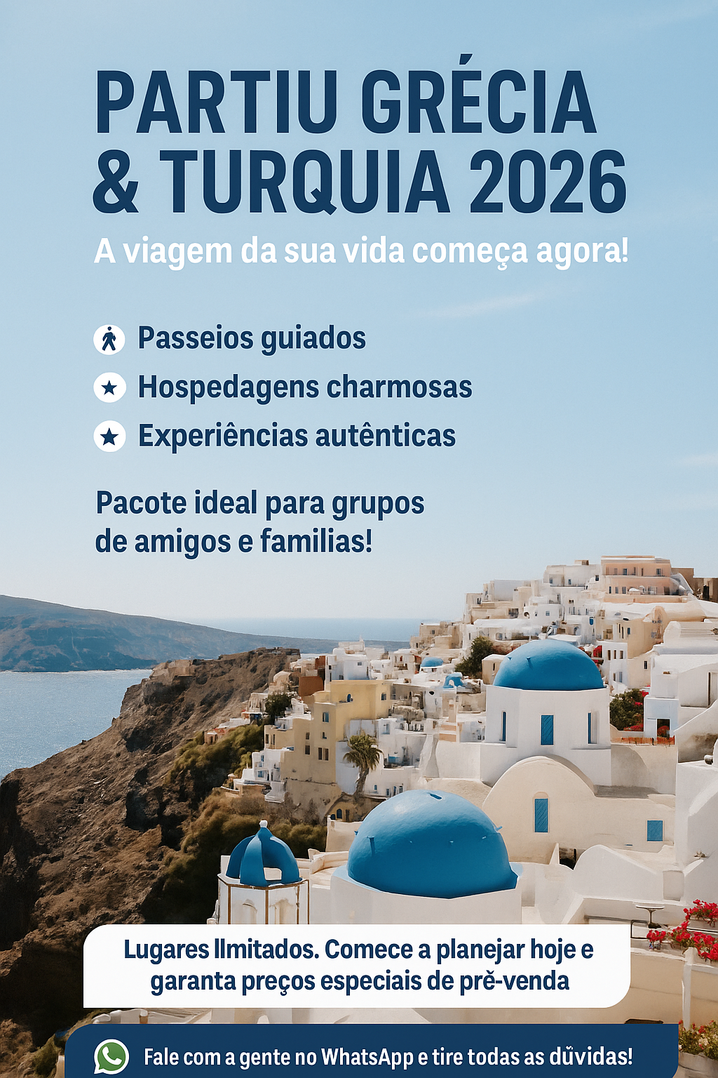 Para o roteiro Grécia e Turquia – setembro de 2026, o valor da cota individual é R$ 25.850,00 (grupo mínimo: 15 participantes).