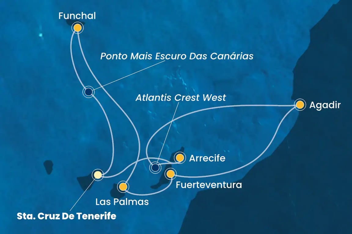 Viva uma experiência completa pelo Atlântico a bordo do elegante Costa Fortuna, navegando entre paisagens vulcânicas, cidades costeiras vibrantes e culturas fascinantes. Este cruzeiro de 8 dias combina o melhor das Ilhas Canárias, a exótica Costa Africana e o charme de Portugal, com embarque principal em Santa Cruz de Tenerife e opção de embarque também em Las Palmas.