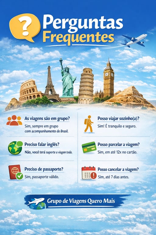 Descubra aventuras incríveis e seguras ao redor do mundo com os roteiros personalizados para a melhor idade do Grupo de Viagens Quero Mais. Roteiro Completo em grupos 2026/2027!
